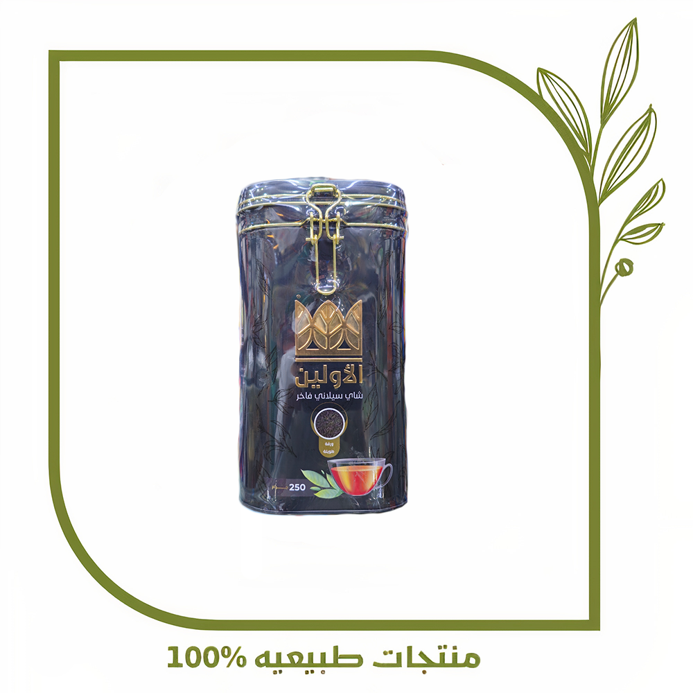 شاي الأولين المقطوف من أشجار الشاي السيلاني الفاخر ، طعم ومذاق فريد في عبوة معدنية فاخرة محكمة الاغلاق لتضمن حفظ النكهة